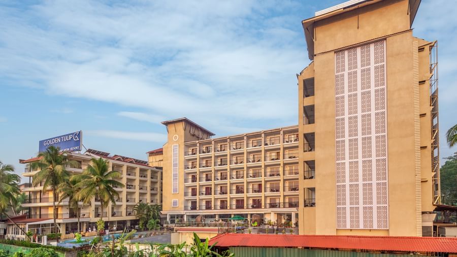 towering hotel buildings featuring balconies, a signage with hotel name, and surrounded by lush greenery, set against a cloudy sky - Golden Tulip, Candolim, Goa