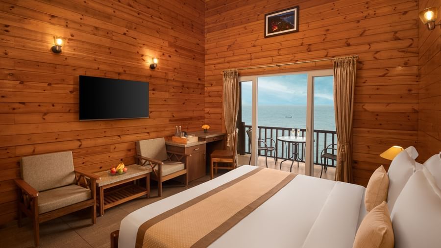 A view of a room at Highland Sarovar Portico, Sindhudurg, featuring a bed, a seating area and a balcony with views of the ocean - Stay in Sindhudurg